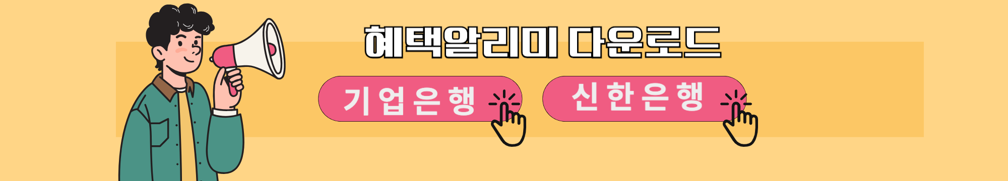 혜택알리미는 별도 앱을 설치하지 않고 기업은행 또는 신한은행 앱을 통해 간편하게 접근할 수 있습니다. 아래는 설치 및 가입 방법입니다: